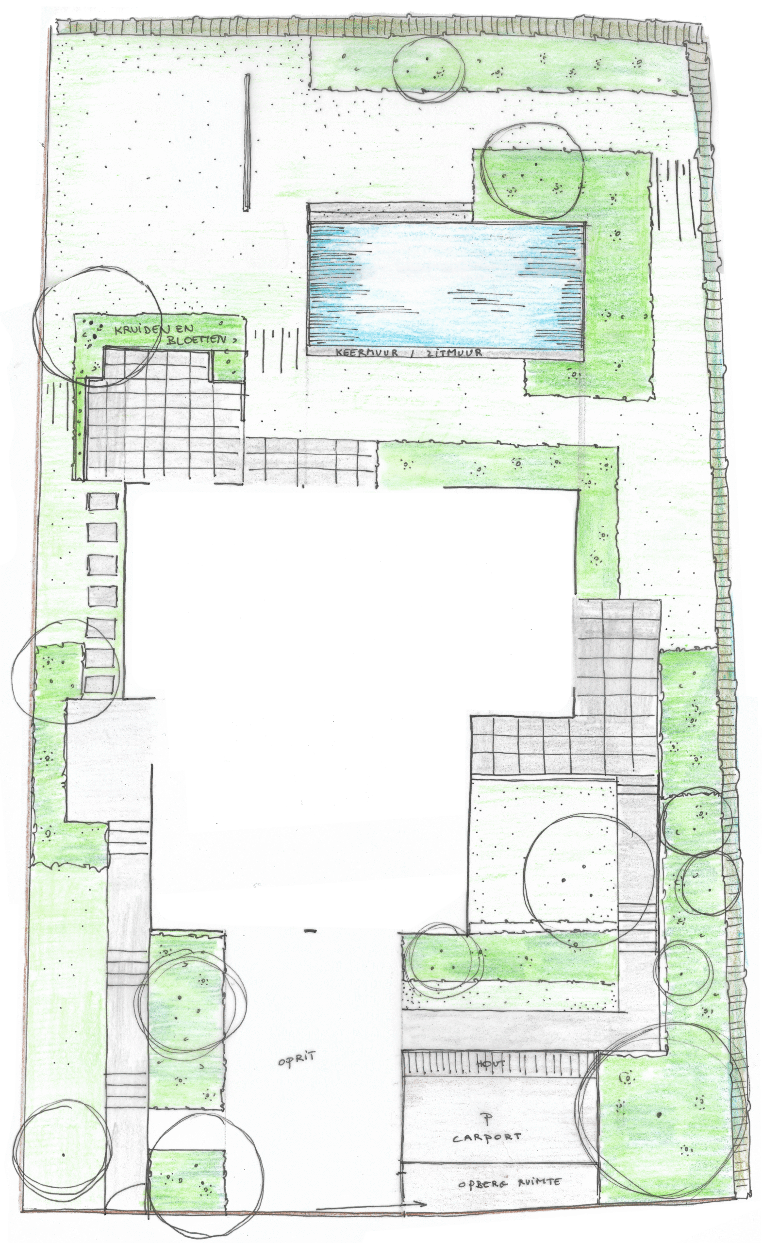 Een eerste, handgeschetst ontwerp dat de grote lijnen van het tuinconcept toont. Dit wordt gepresenteerd samen met referentiebeelden om het gevoel van de tuin visueel te maken.